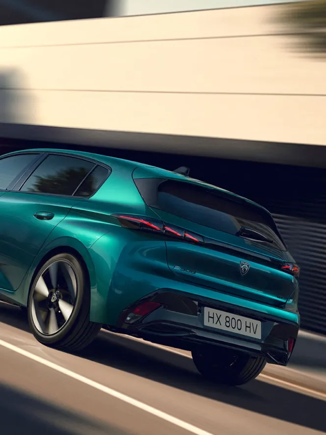 With its new illuminated front face, exclusive diamond-cut wheels, and bold Bleu Lagoa colour, the new PEUGEOT E-308 showcases a truly distinctive and striking style.